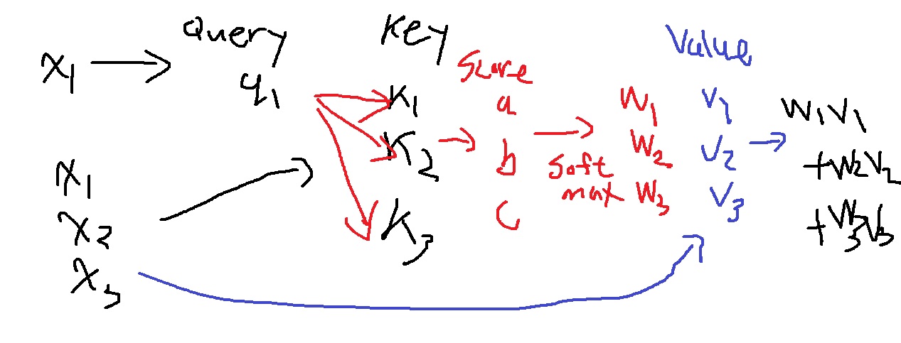 seq2seq의 decoding hidden vector같은 역할을 하는 x1의 query는 x1,x2,x3 중 어느 벡터의 정보를 더욱 집중적으로 가져올지 생각하는 벡터가 된다.