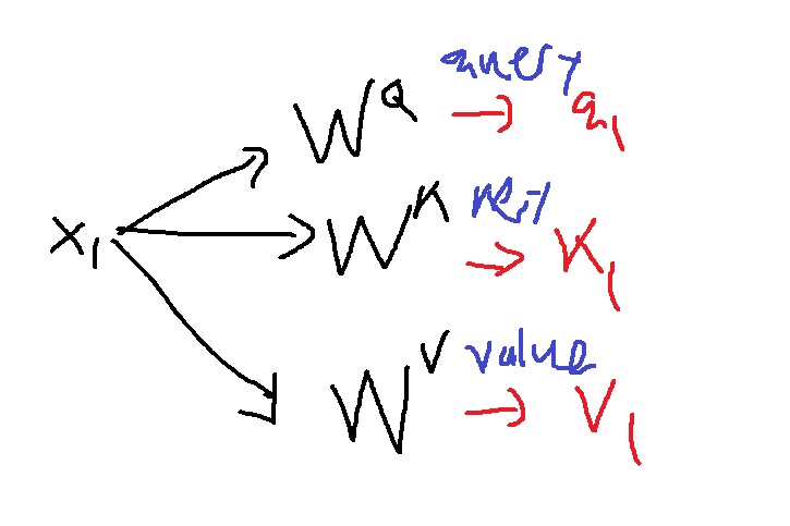 이들을 이용해서 하나의 word embedding vector x1은 3가지 query q1, key k1, value v1을 뽑아낼 수 있다.