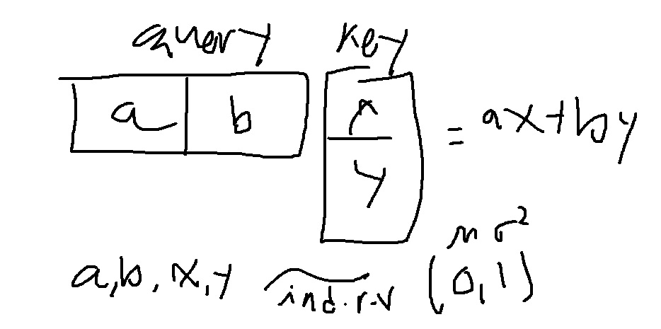 query, key의 성분 a,b,x,y가 서로 독립이고 평균이 0, 분산이 1인 random variable이라고 하자.