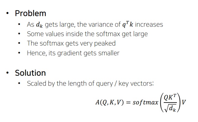 key,query matrix의 차원 $d_{k}$의 제곱근으로 $QK^{T}$를 나눠줬다.