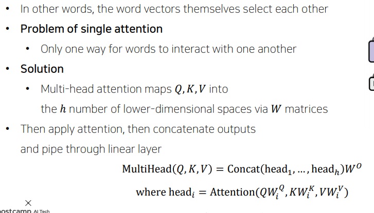 단 1번의 self attention은 1가지 측면에서만 word들의 attention 측면을 고려하지만 필요에따라 attention 측면을 여러 방면에서 수행할 필요가 있다.