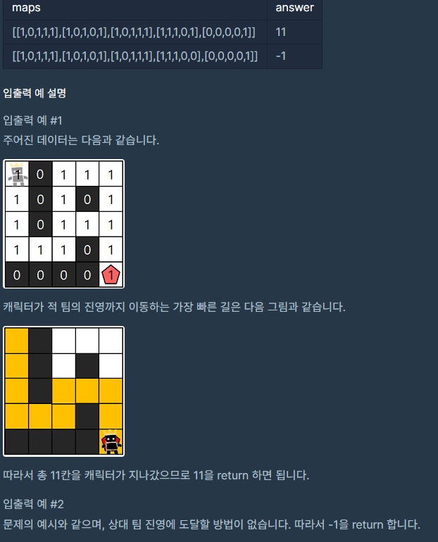 게임 맵의 상태 maps가 매개변수로 주어질 때, 캐릭터가 상대 팀 진영에 도착하기 위해서 지나가야 하는 칸의 개수의 최솟값을 return하도록 solution 함수를 완성하세요.