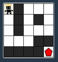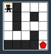 지금부터 당신은 한 팀의 팀원이 되어 게임을 진행하려고 합니다. 다음은 5*5 크기의 맵에, 당신의 캐릭터가 (행:1, 열:1) 위치에 있고, 상대 팀 진영은 (행: 5, 열: 5) 위치에 있는 경우의 예시입니다.