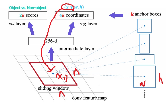 각 중앙 포지션마다 n*n spatial feature map을 sliding window 시키면서 1개의 지점마다 k개의 anchor box를 생성