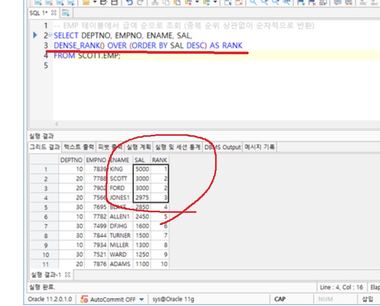 반면 dense_rank() over(order by ~)는 동일한 값은 중복 순위를 부여하지만 그 다음 순위는 그대로 순차적으로 부여함