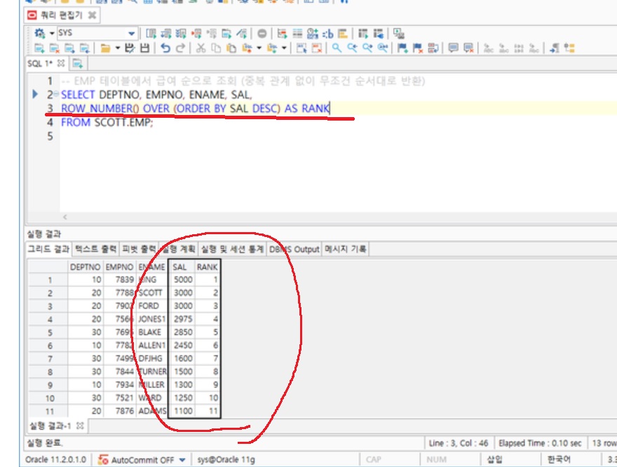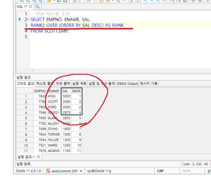 위와 같이 중복된 값 3000 3000에도 순위가 1,2,3,4,5,6,... 순차적으로 부여된다