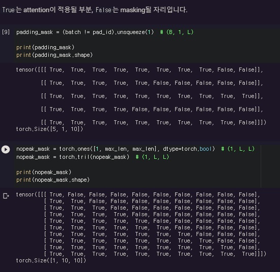 실제 구현 코드, padding mask와 0으로 만들어야하는 mask를 만들어 둘을 합친다.