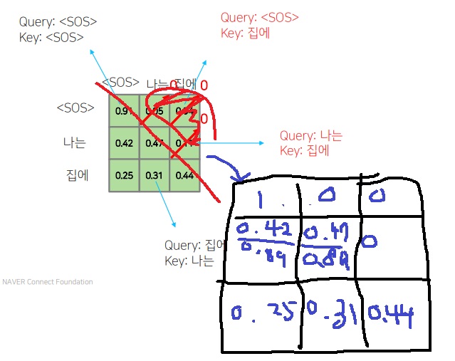 다음 단어에는 집중하지 못하도록, 오직 현 step의 이전 단어에만 집중할 수 있도록 대각선 위 부분의 score를 0으로 만들어버림..