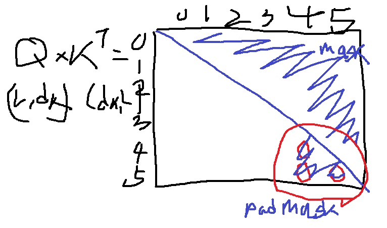 다음 단어에는 집중하지 못하도록, 오직 현 step의 이전 단어에만 집중할 수 있도록 대각선 위 부분의 score를 0으로 만들어버림..