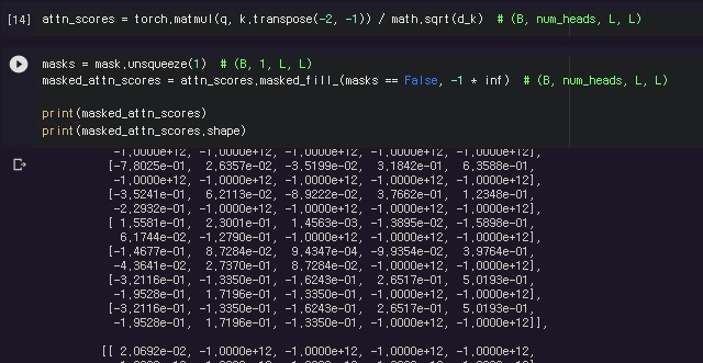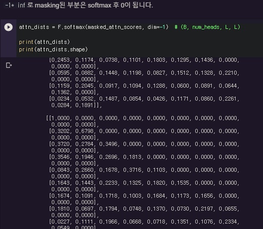 실제는 이제 마스크부분을 -inf로 주고 softmax를 취하는 과정을 거쳐 0으로 만든다