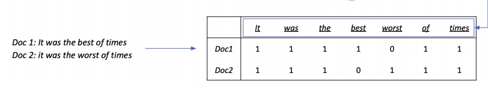 예를 들어 it was the best of times하면 it, was, the, best, of, times 각각 unigram vocab 각각 한단어씩 비교해서 있으면 1, 없으면 0으로 mapping