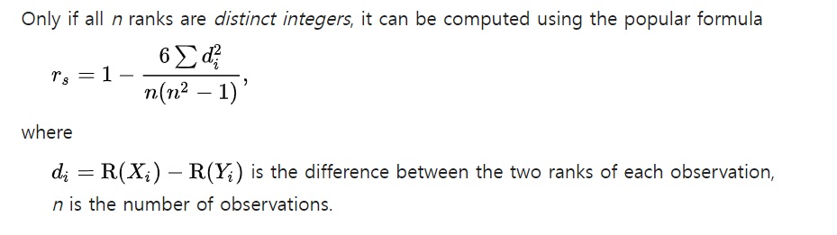 두 변수의 순위(rank)에 대한 피어슨 상관계수와 정확히 동일하다.