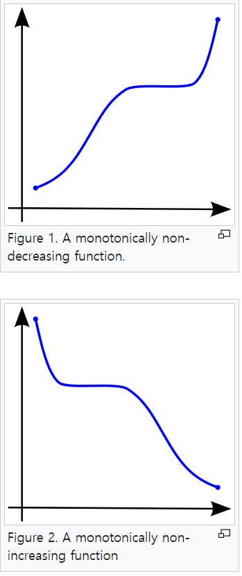 단조적 감소(monotonic decreasing)은 X1 <= X2이면 Y1 >= Y2인 것이다.