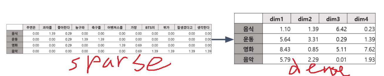 TF-IDF같은 embedding은 벡터 크기가 매우 크지만 0인 숫자가 대부분인 sparse vector이다.