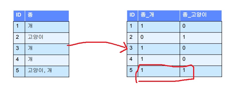 id 2는 고양이에 속하므로 개에 0을 주고 고양이에 1을 주어 (0,1)로 encoding한다