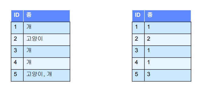 위의 그림에서 id 1은 개에 속하므로 개에 1을 주고 고양이에 0을 주어 (1,0)으로 encoding하고
