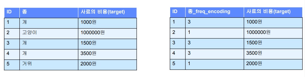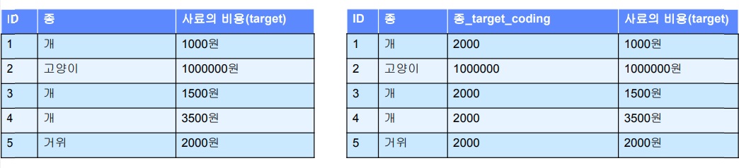 위의 그림을 보면 id 1,3,4는 개인데 target값이 1000,1500,3500이므로 그 평균은 2000이어서 개는 2000으로 encoding함
