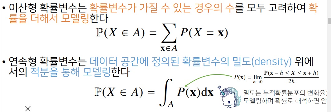 확률변수가 공간 A에서 가질 수 있는 모든 경우의 수를 고려한 확률의 합으로 구해진다.