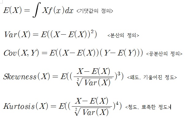 기댓값이 1차 적률, 분산이 2차 적률, 왜도는 3차 표준화적률, 첨도는 4차 표준화적률