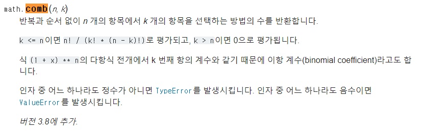 참고로 조합의 수, 순열의 수도 itertools의 combinations, permutations의 len으로 구하는게 아니라