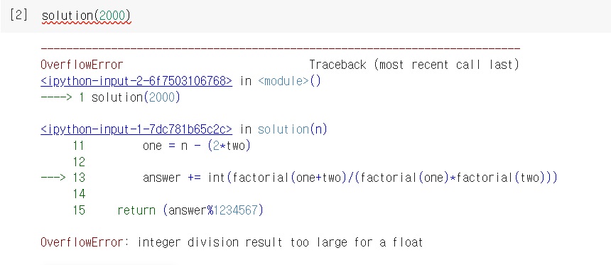 아무튼 이렇게 하면 문제가 n=2000에서 overflow error가 뜬다