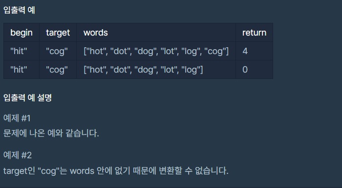 두 개의 단어 begin, target과 단어의 집합 words가 매개변수로 주어질 때 최소 몇단계의 과정을 거쳐 begin을 target으로 변환할 수 있는지 return하도록 solution 함수를 작성하세요