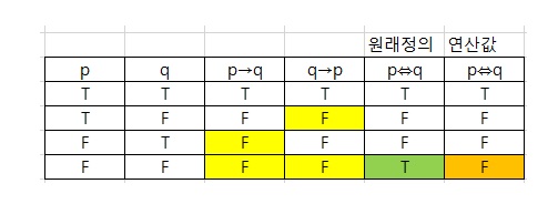 여기서 주목할 부분은 p⇔q 연산은 p→q, q→p의 and 연산이라는 것을 알 수 있다