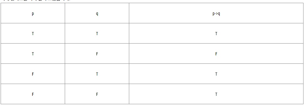 그러니까 p가 참이면 q가 참일때 'p이면 q이다'는 참이고 q가 거짓이면 'p이면 q이다'는 거짓이다