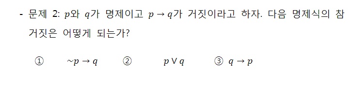 혹은 대우명제 ~q → ~p는 p → q의 참,거짓과 동일하다.