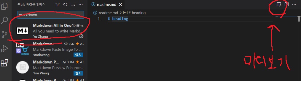 확장에서 markdown all in one 다운 받고 오른쪽 상단에 미리보기도 제공함