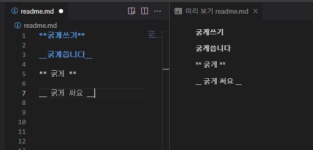 **이나 __ 으로 둘러싸면 글씨를 굵게 씀