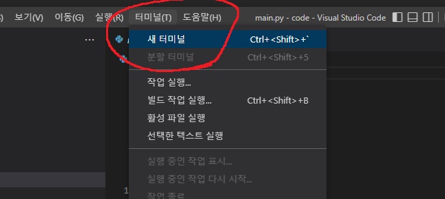 상단 메뉴에 터미널 - 새 터미널
