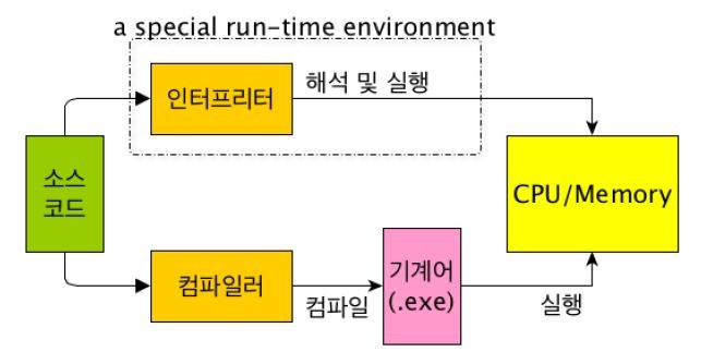 인터프리터언어: 소스코드를 실행시점에서 바로 해석하여 컴퓨터가 직접 처리, 실행때마다 수행하므로 속도가 느리나 메모리가 적게 필요함
