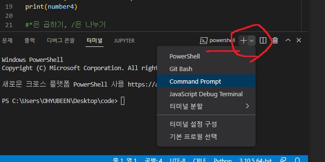 하단에 터미널 생기는데 기본값은 powershell이다