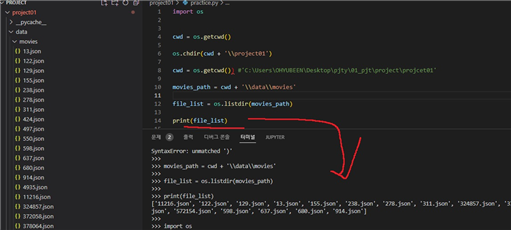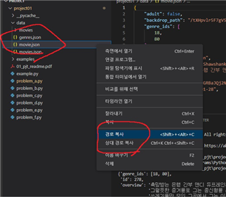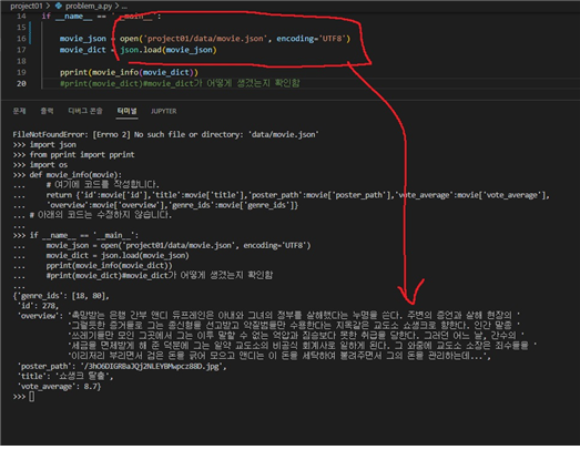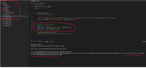 왼쪽 상단에 보면 movie.json 파일은 ~/01_pjt/project/project01/data/movie.json에 존재하므로 파일을 찾지 못하는 것