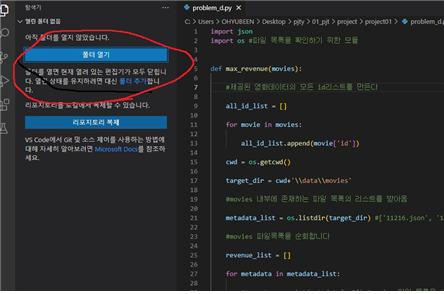 폴더 열기를 누르고 현재 작업 디렉토리를 설정함