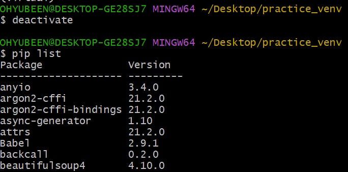 $ deactivate 하면 가상환경이 비활성화