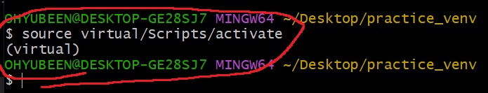 gitbash : $ source (가상환경 경로)/Scripts/activate (윈도우 기준)