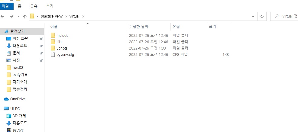 빈 폴더 practice_venv에 $ python -m venv virtual 하면 virtual이라는 가상환경 폴더가 생성