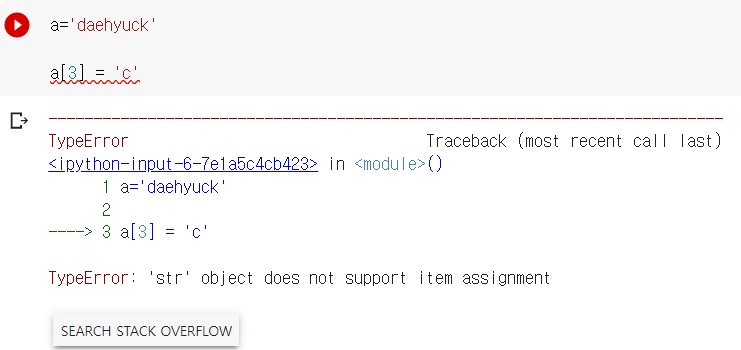 문자열이 변경불가능하다는 것은.. 리스트는 index로 a[i] = 3처럼 i번째 원소를 쉽게 바꿀 수 있는데