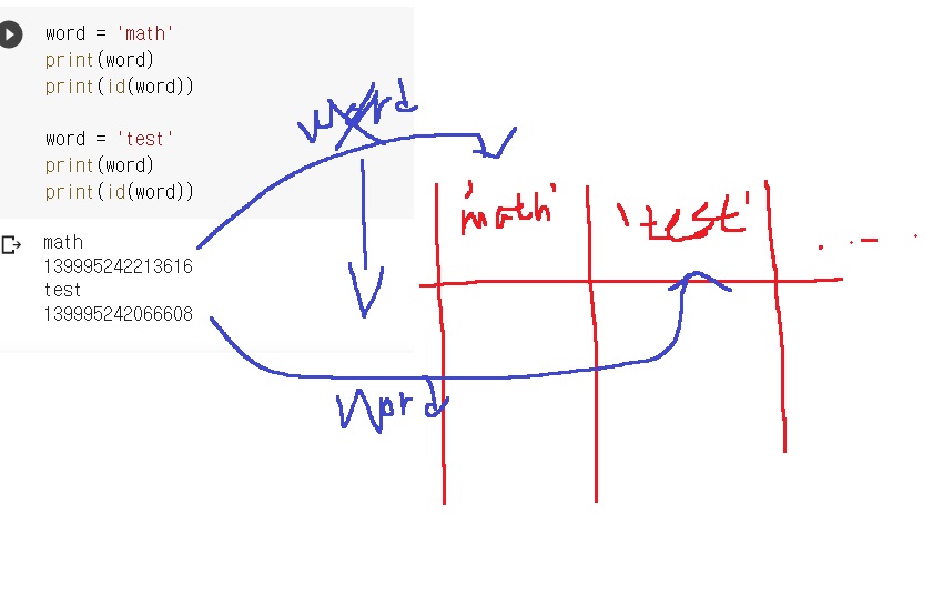 word안에 'math'가 들어간 다음에 다시 word에 'test'가 들어가면서 word에 들어간 문자열이 변경되는거 아니냐??