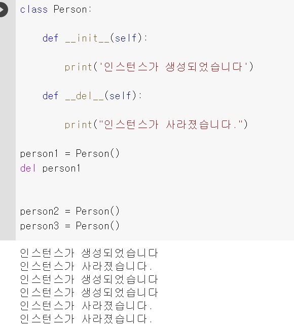 person2, person3는 del로 삭제하지 않았는데 하나의 프로그램이 끝나니 garbage collector가 자동으로 person2, person3를 수거해가서 사라졌다고 나옴