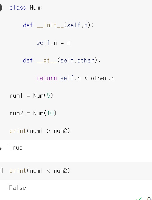 5가 10보다 크냐고 물어보면.. __gt__가 호출되는데 나는 결과를 그 반대인 self.n < other.n으로 정의해서