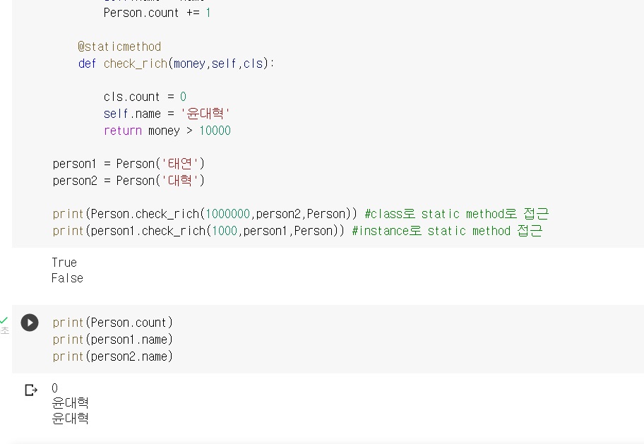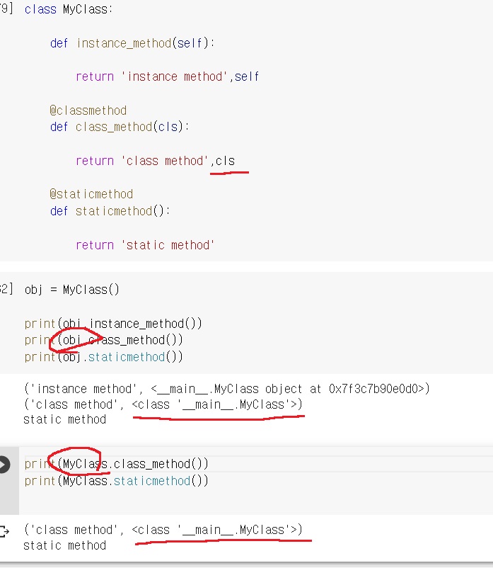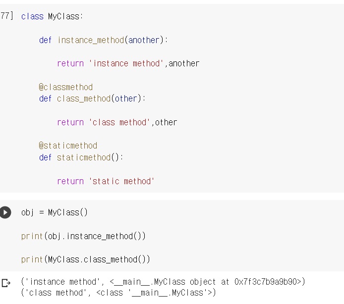 심지어 위 그림을 보면 알겠지만.. instance.(classmethod)()해도 cls에 instance가 들어가는게 아니라 instance의 class가 자동으로 들어간다는 것도 확인 가능하다