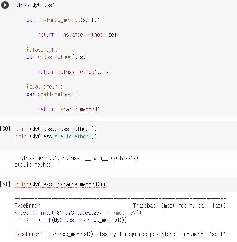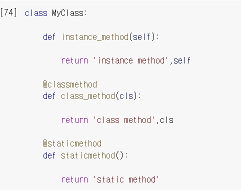 class는 class method, static method는 호출할 수 있지만 instance method는 호출할려면 self인자를 내놓으라고 에러남
