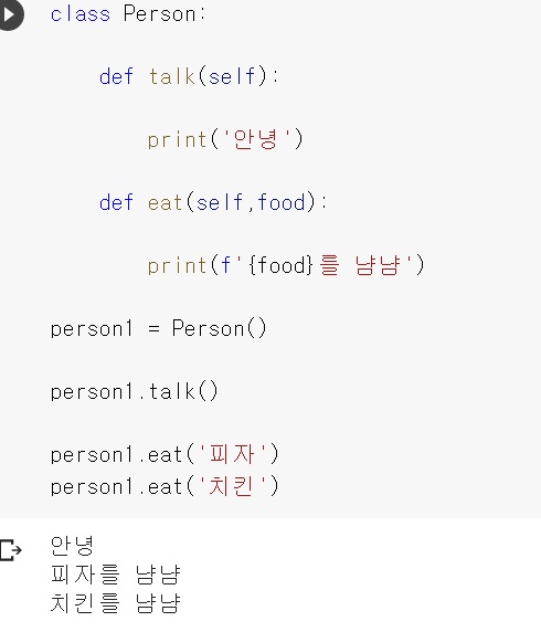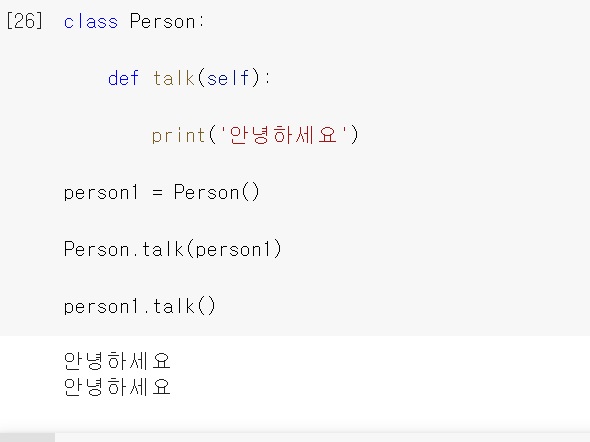 함수 쓰듯이 할려면 Person.talk(person1)으로 self에 instance를 전달하는 식으로 쓰지만..