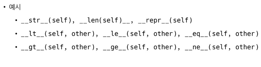 double underscore(__)가 양쪽에 들어간, 특수한 동작을 위해 파이썬에서 만들어진 method