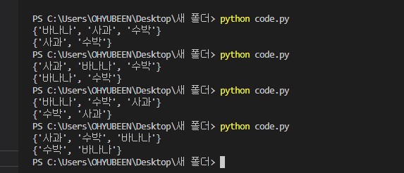 set은 순서가 없는 자료형이기 때문에 s.pop()을 하면 랜덤하게 항목을 제거해서 반환한다고함