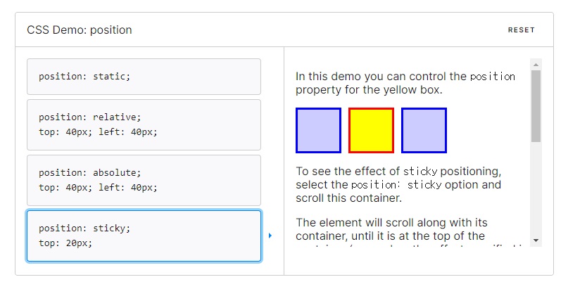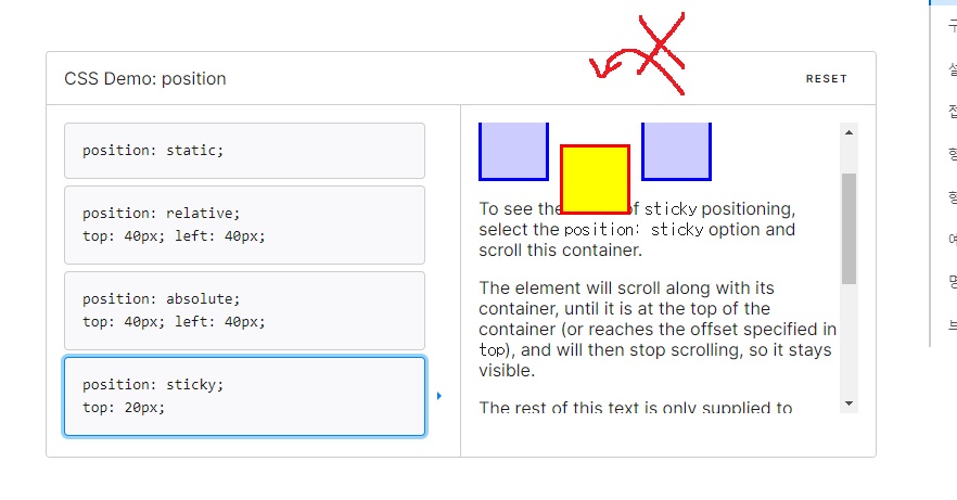 위와 같이 fixed처럼 따라 붙으며.. 원래 자리를 여전히 차지하고 있어서 그런지 relative처럼 3번째 파란색 박스가 2번째로 오지 않는다