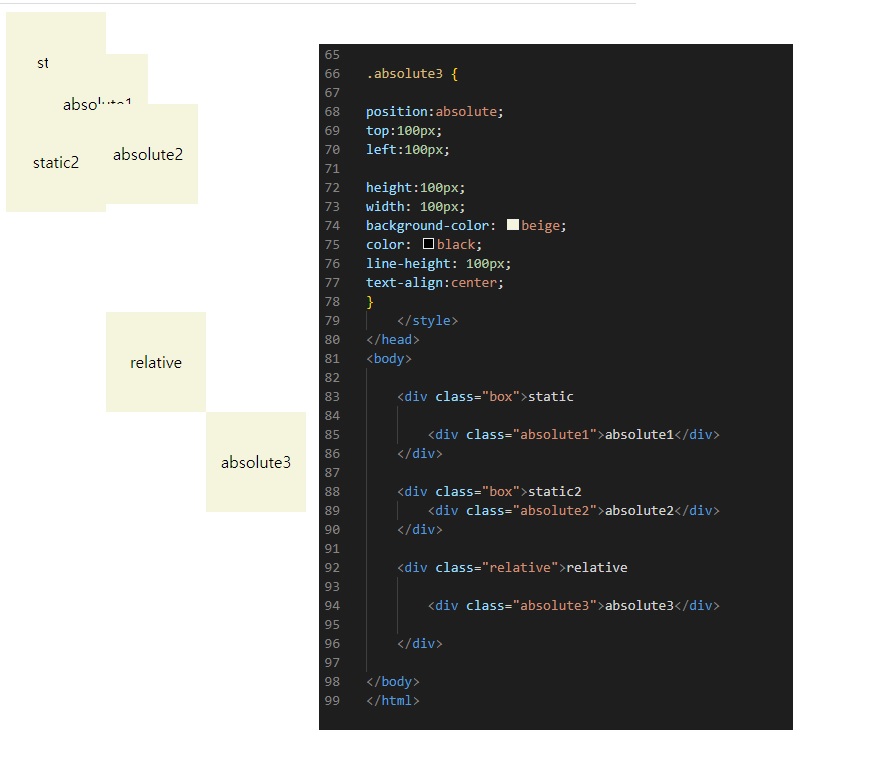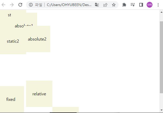 위 그림을 보면, static1, static2 각각을 기준으로 absolute1, absolute2를 만들어보았지만.. 두개의 absolute 모두 동일한 위치를 기준으로 50px, 100px씩 이동했다는 것